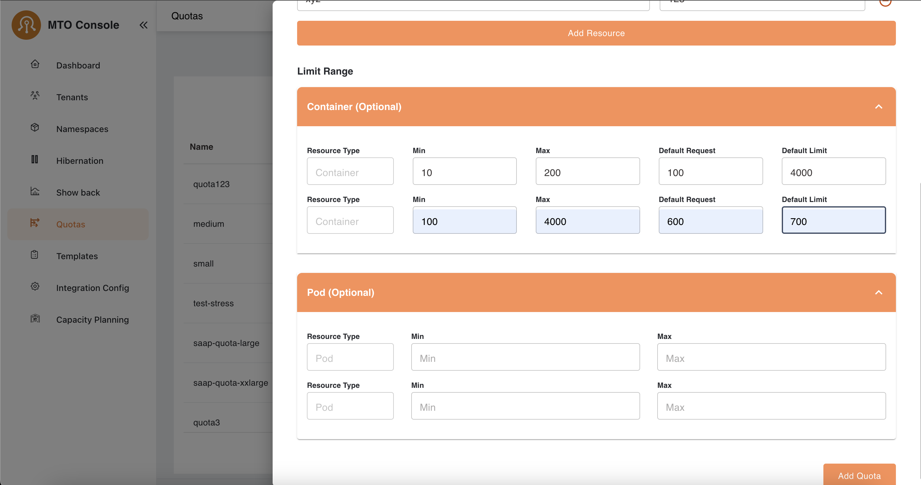 The quota creation process allows administrators to define resource limits and optional configurations for containers and pods. This document outlines the steps to create a new quota, including the metadata, resource quota, and limit range configurations.