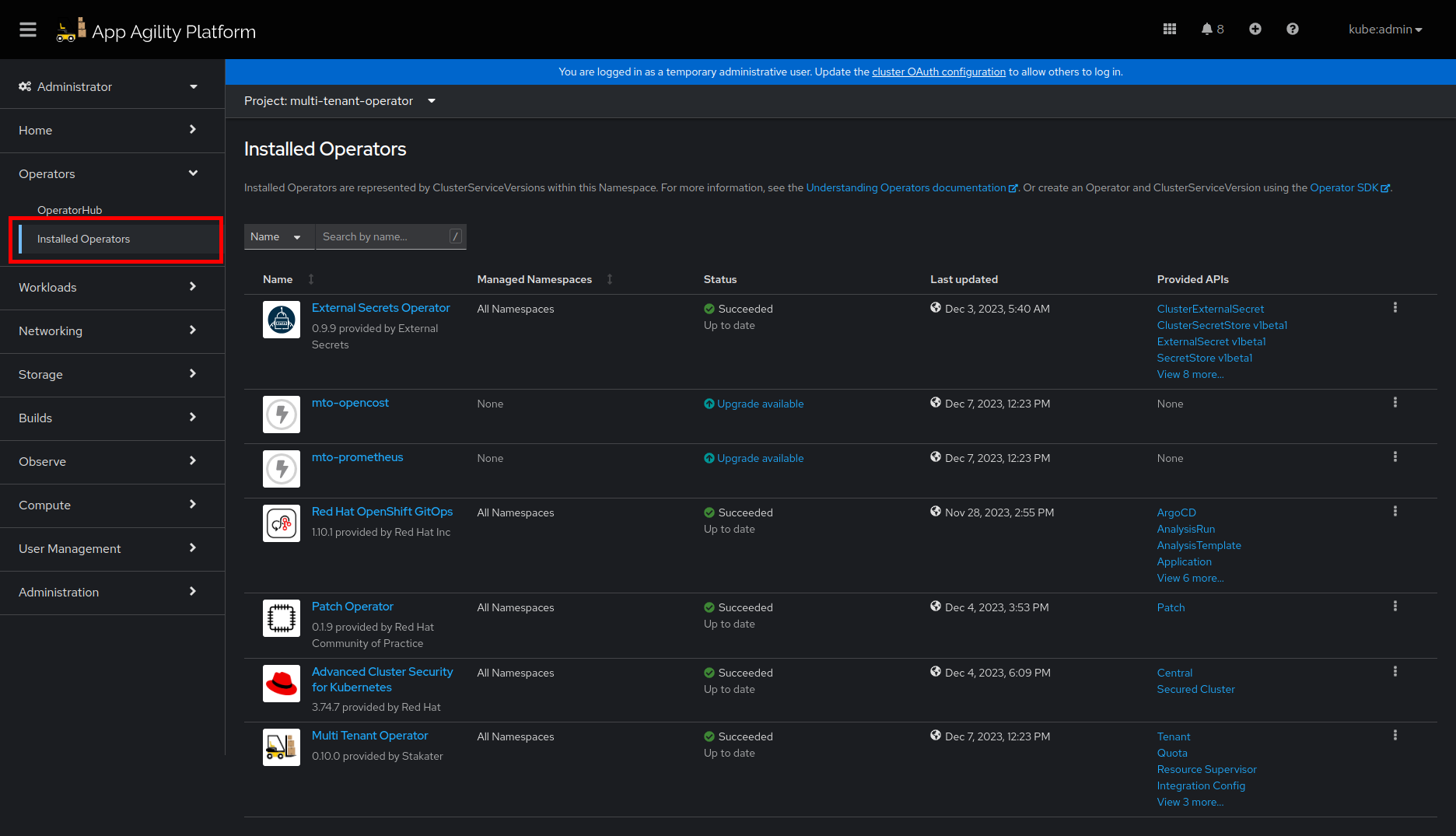Updated channel. Selectmulti-tenant-operatorto install the operator inmulti-tenant-operatornamespace fromInstalled Namespacedropdown menu. After configuringUpdate approvalclick on theinstallbutton.