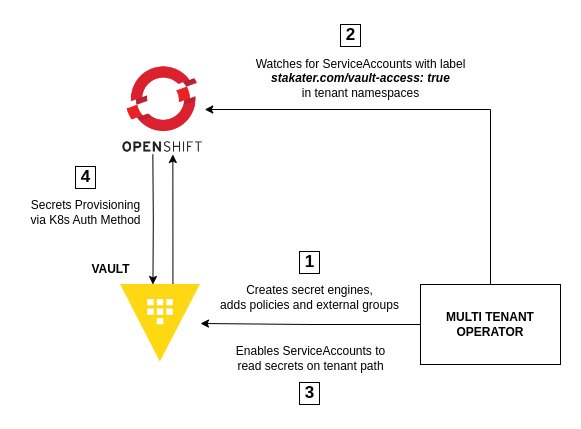 The Diagram shows how MTO enables ServiceAccounts to read secrets from Vault.