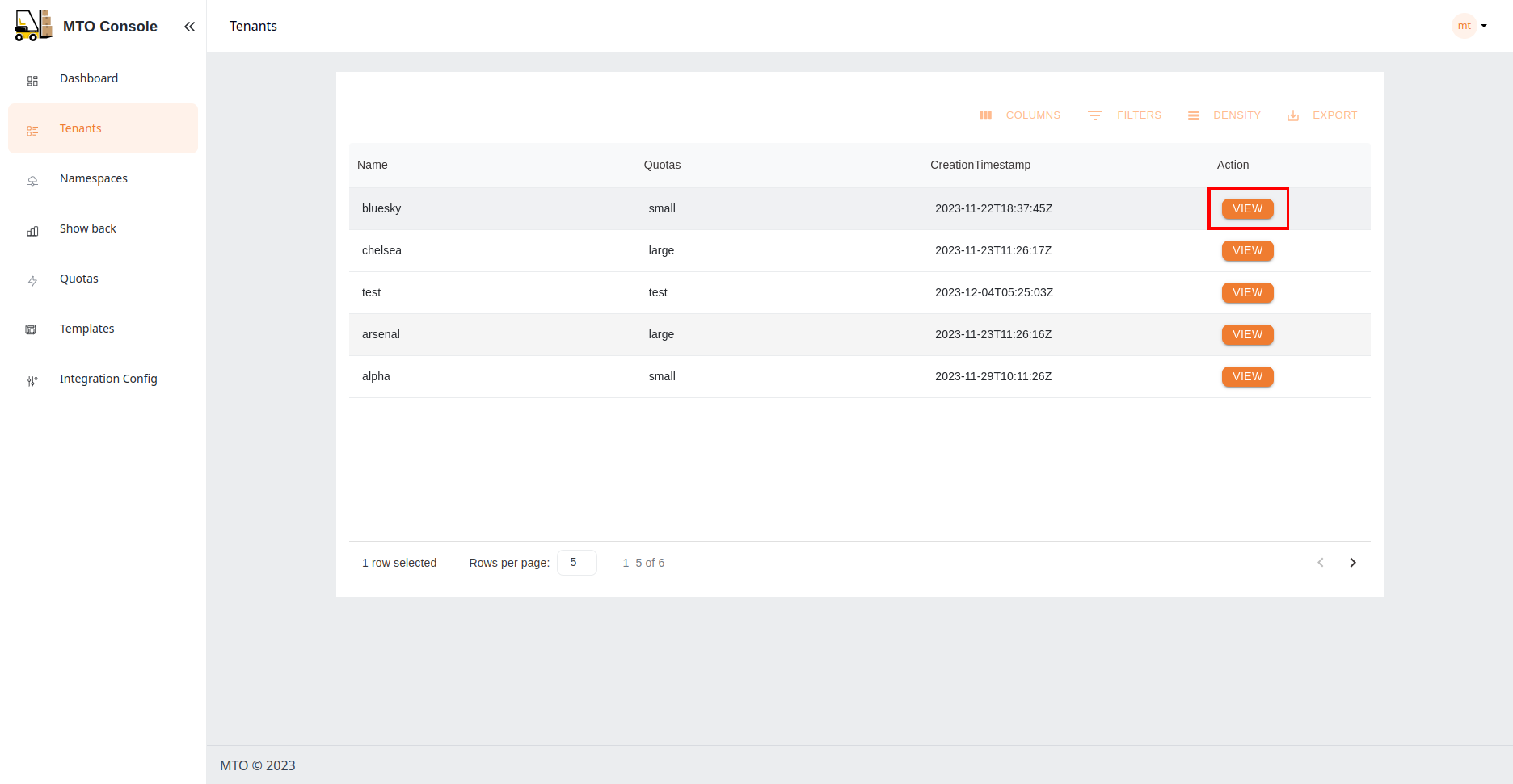 • Navigate to Tenants page on the MTO Console using the left navigation bar. Tenants