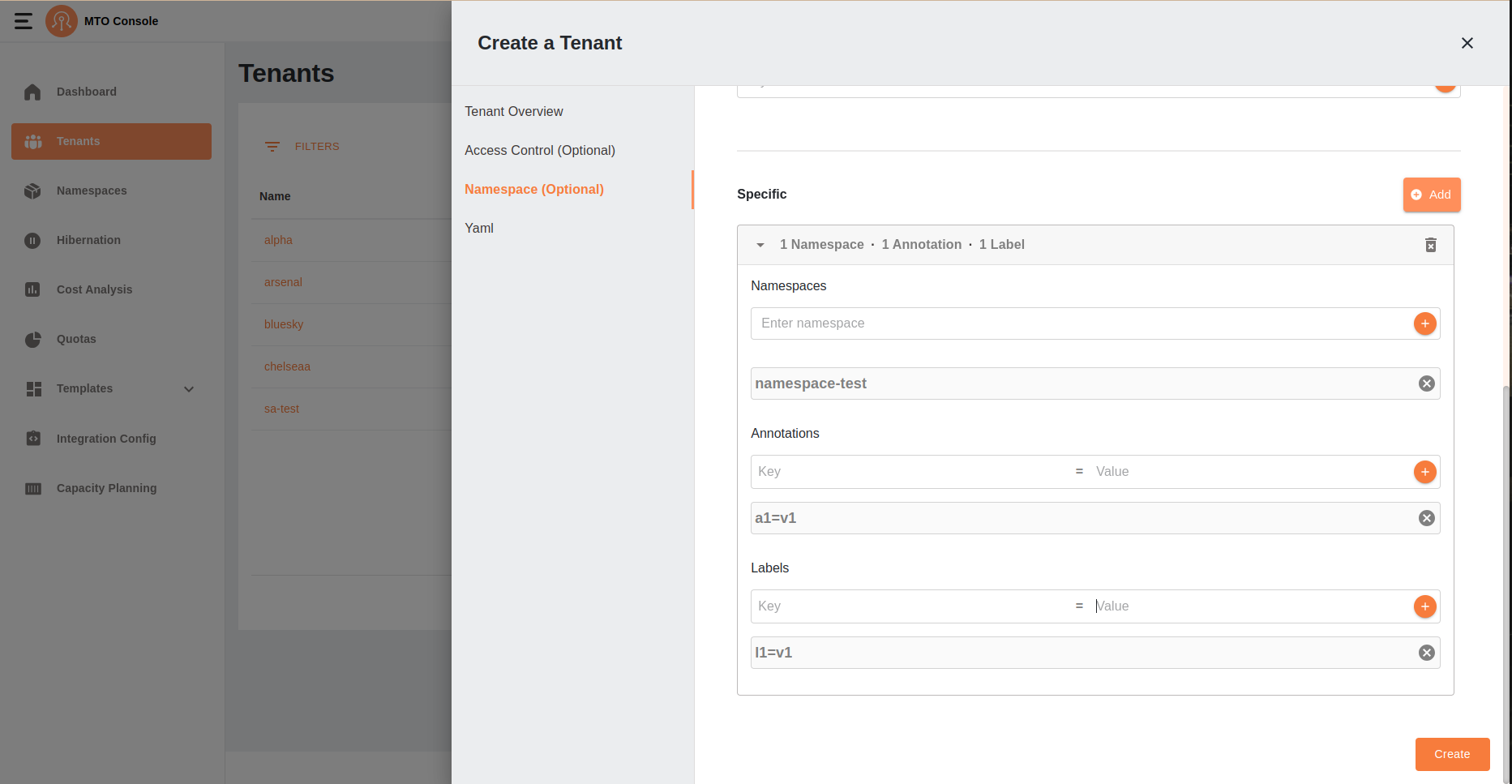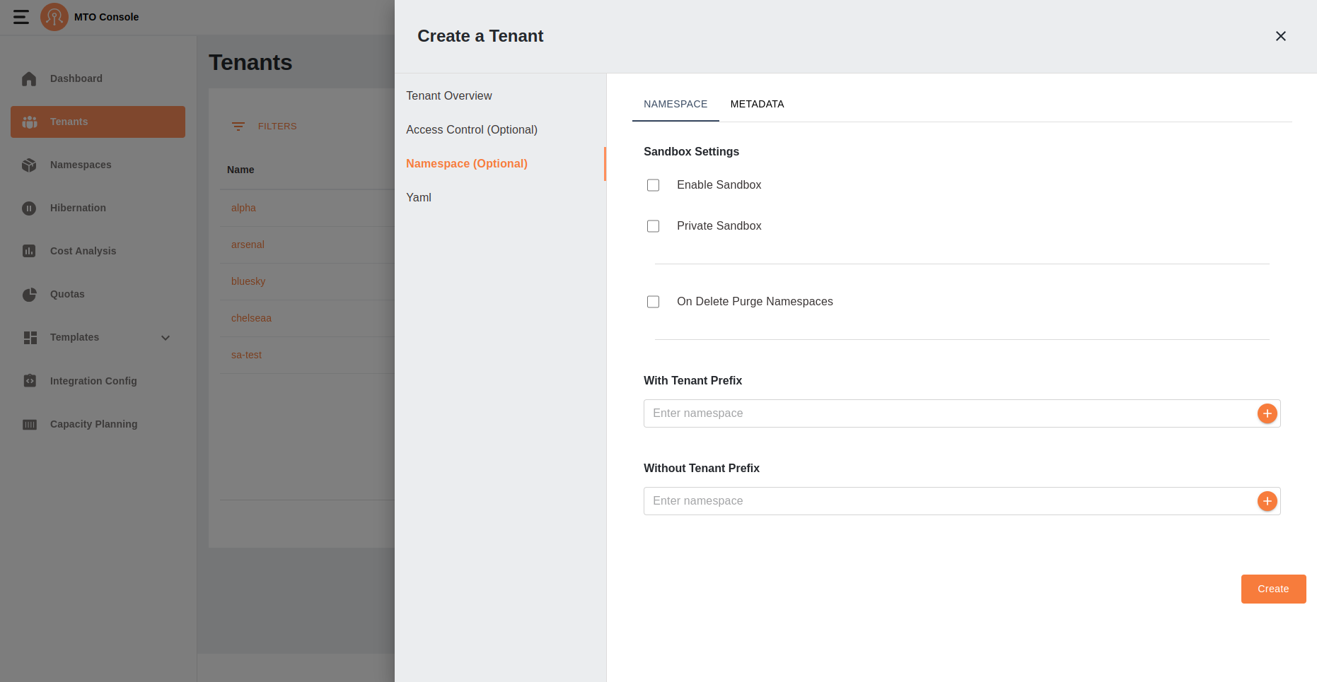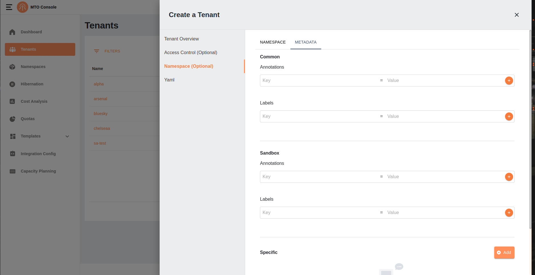 This section allows users to optionally configure namespaces and metadata for the tenant. This section consists of two tabs: