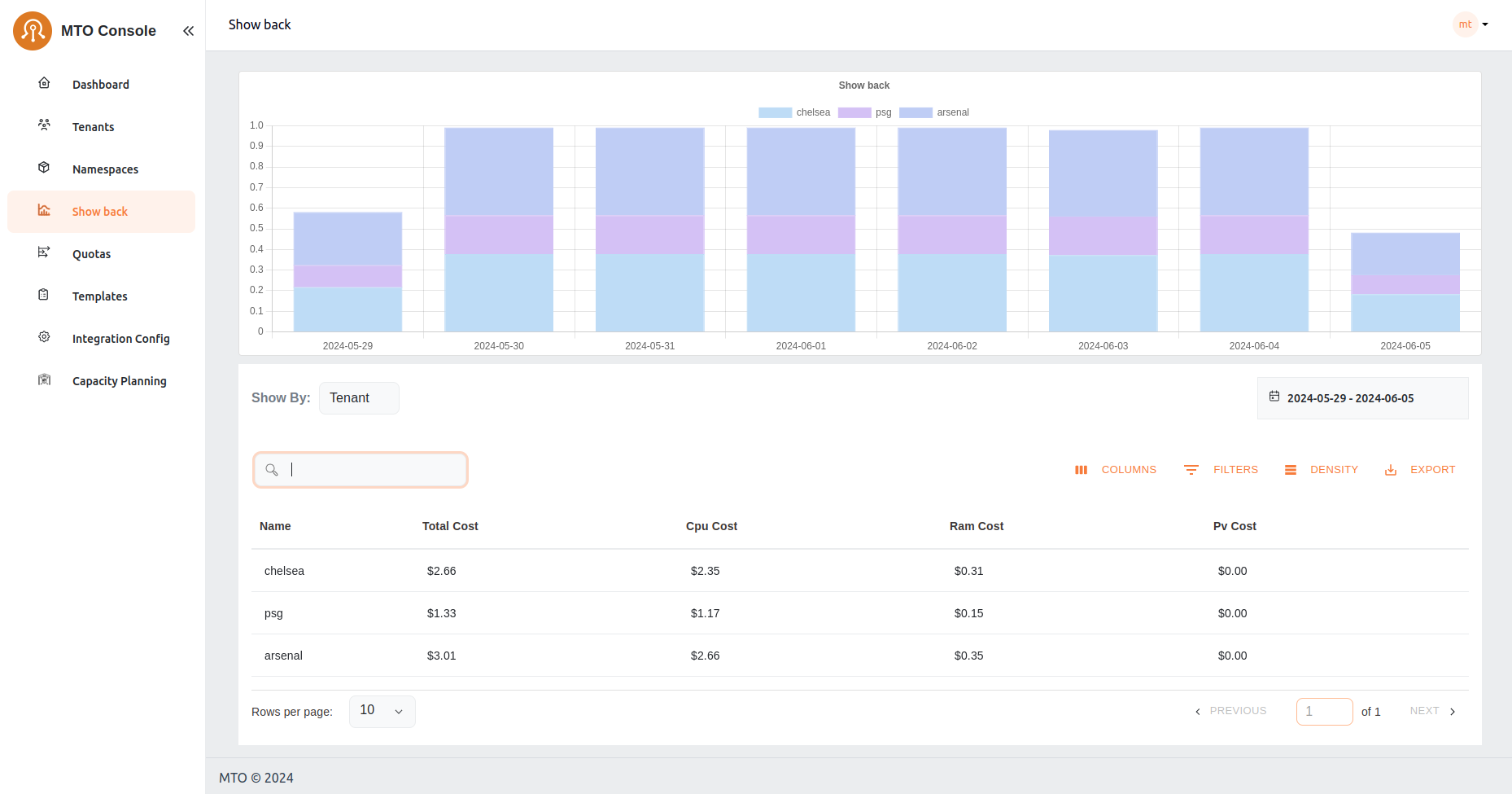 The Showback feature is an essential financial governance tool, providing detailed insights into the cost implications of resource usage by tenant or namespace or other filters. This facilitates a transparent cost management and internal chargeback or showback process, enabling informed decision-making regarding resource consumption and budgeting.